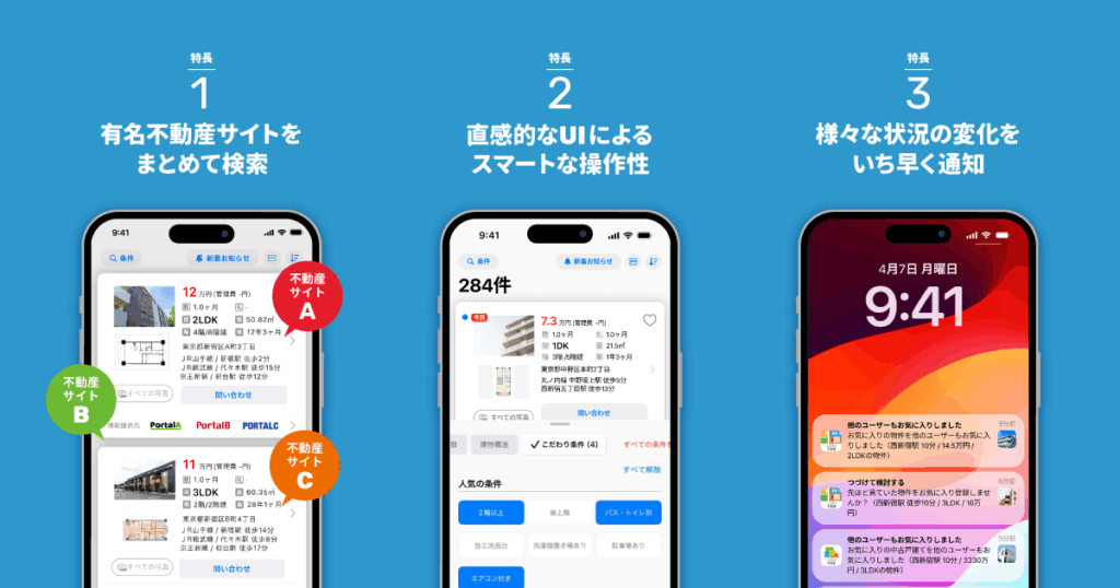 本アプリの特長は、何よりも「ユーザー起点の体験設計」にあります。直感的な操作性を重視したUI/UXをベースに、住まい探しの手間を軽減し、意思決定をスムーズに後押しする仕組みを整えています。お気に入り登録した物件に価格変更があった際に通知を受け取れる「価格変更Push」(iOS/購入版)や、他ユーザーの注目状況をリアルタイムでお知らせする「お気に入りPush」(iOS、Android/賃貸版・購入版)などがその代表です。