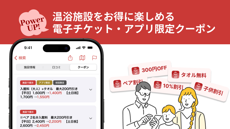 『電子チケット』は、温浴施設のチケットを割引価格で事前購入でき、利用当日にキャッシュレスでスムーズな入館ができるサービスです。これにより割引クーポン、電子チケットのある施設が大幅に増加し、アプリでは500施設以上、1,700種類以上の割引・特典が利用可能(2025年10月現在)になりました。