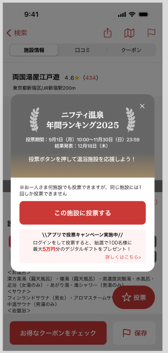 3. 施設詳細ページの「ニフティ温泉年間ランキング2025 投票ボタン」から投票し、自動応募完了!