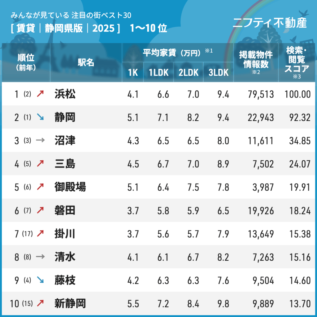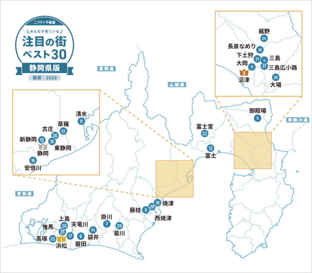 浜松・静岡の二大都市が圧倒的人気!「静岡の賃貸物件探しで注目の街ランキングベスト30」を発表(2025年調査)【ニフティ不動産】