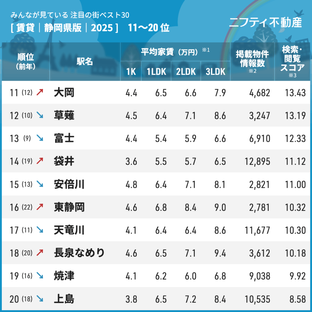 今回は、静岡県で賃貸物件を探しているユーザーからの注目を集めた街ランキング(ベスト30・2025年)を発表いたします。