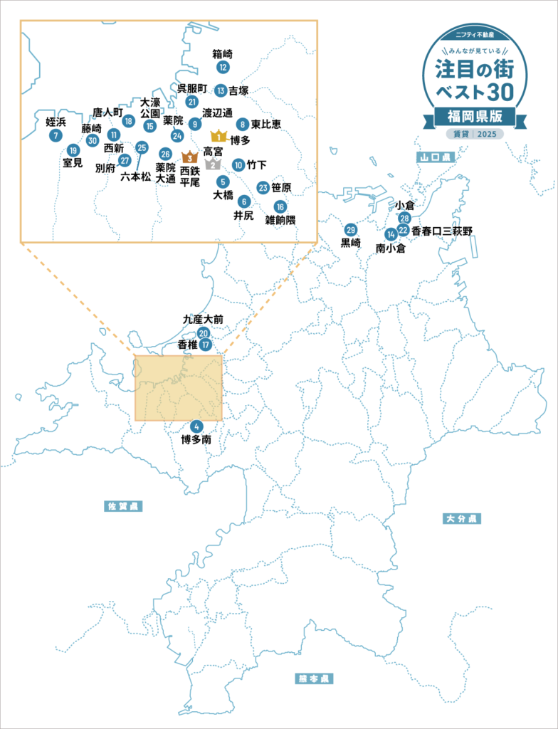 今回は、福岡県で賃貸物件を探しているユーザーからの注目を集めた街ランキング(ベスト30・2025年)を発表いたします