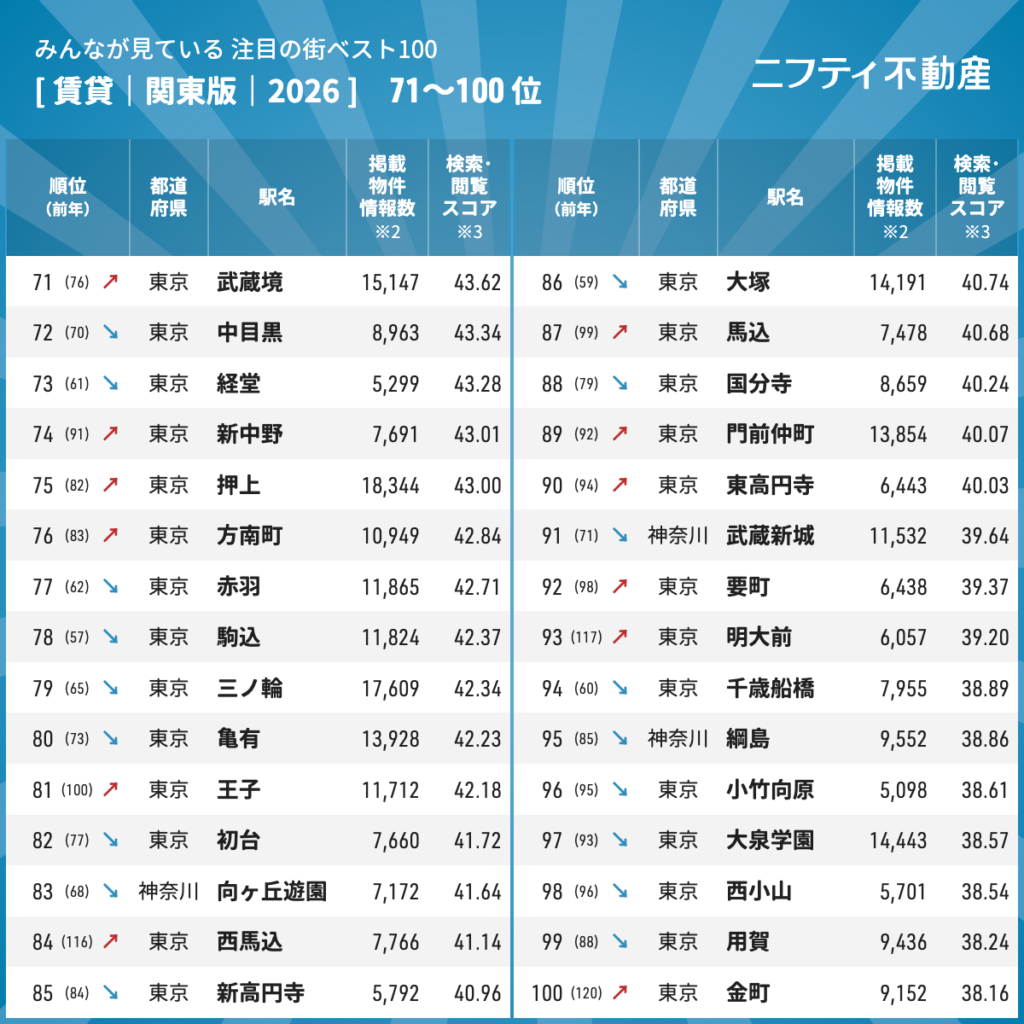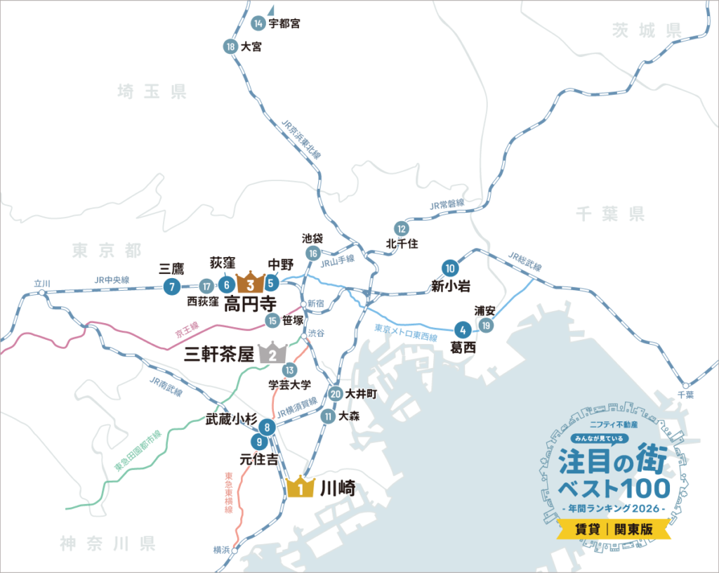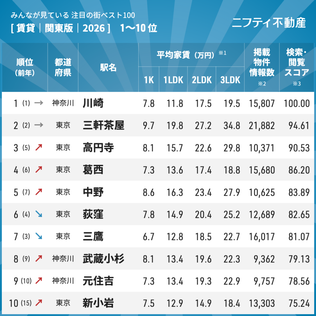 【関東ベスト100】注目の街年間ランキング2026発表!「川崎」が2年連続首位、交通利便性と住みやすさで支持拡大【ニフティ不動産】