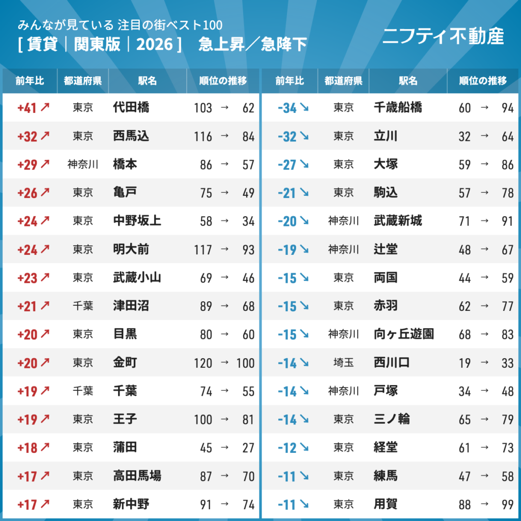 ▷ 急上昇/急降下ランキングも発表 !代田橋が大幅ランクアップ